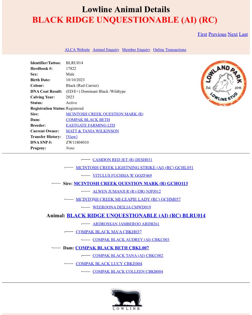The fact that our Lowline cattle are DNA typed and Parent verified before registration and having a closed Herd Book where no unverified animals can be added, has resulted in a line of pure Aberdeen Angus cattle now named ‘Australian Lowline’. They can be traced back to the origins of the breed in Canada and Scotland – a rare fact in the cattle world of breed improvement by ‘breeding up’ and ‘genetic crossbreeding’. Very few breeds today can trace their heritage through a closed Herd Book back to their origins.