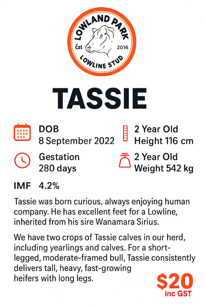 Lowland Park Tassie 3 May 2024, 20 months old, 450 kg Liveweight